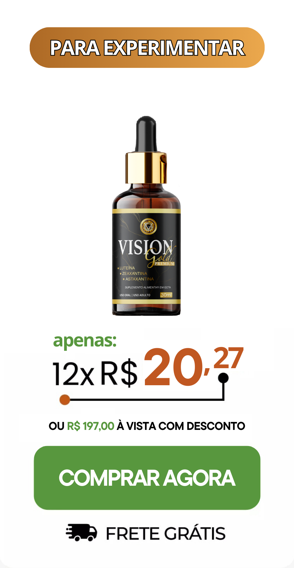 O Vision Gold é simples de incorporar na sua rotina, você toma 12 gotas da nossa fórmula abaixo da língua, apenas uma vez ao dia, preferencialmente pela manhã em jejum.