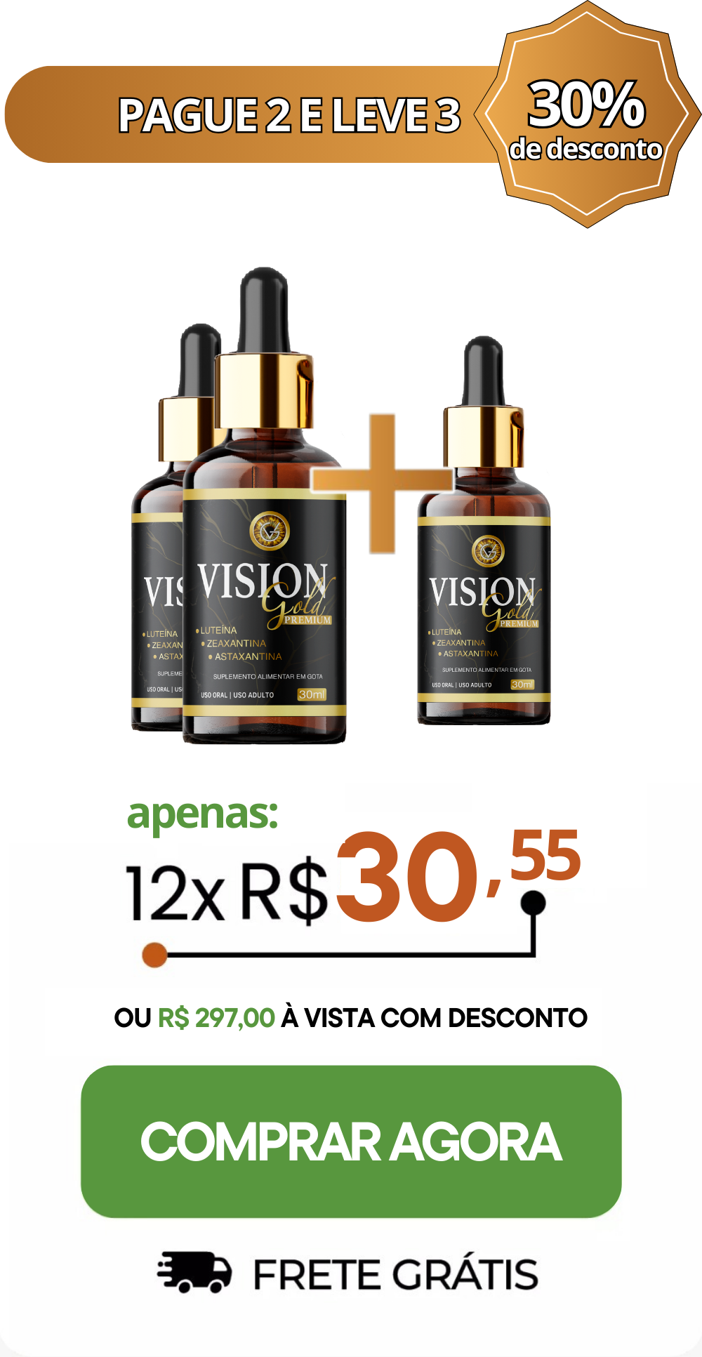 Com a Vision Gold, a experiência é outra: ou você se encanta com os resultados obtidos… ou nós recolhemos todos os frascos de volta, pagando o mesmo valor que você desembolsou!